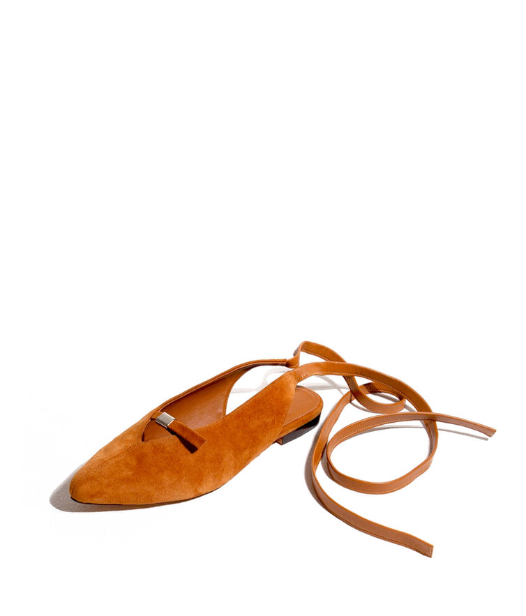 A pointed-toe slingback flat with wrap-around ankle straps, complemented with our hardware. Refined, playful, and effortlessly modern.
